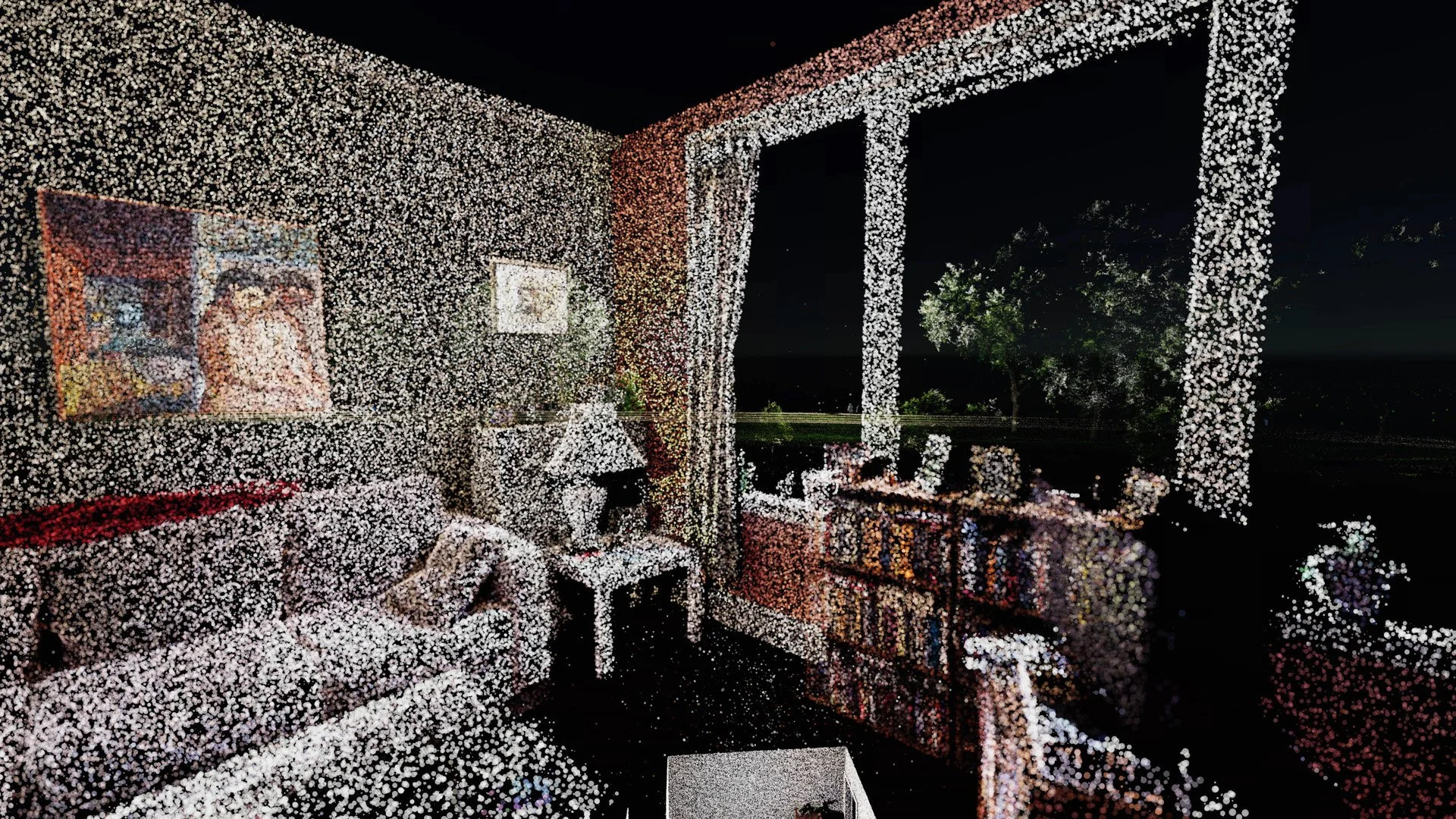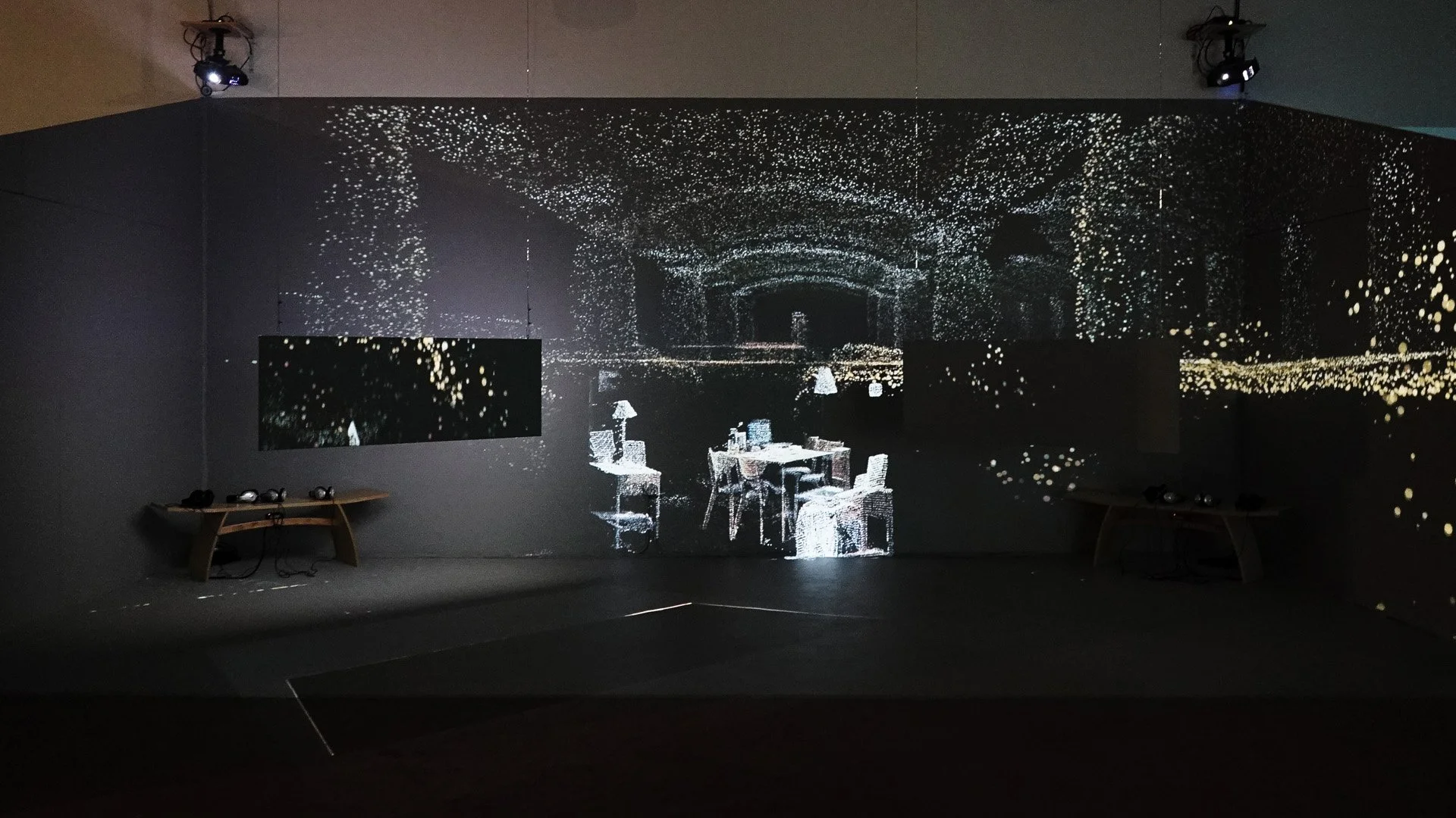 BELOW: Visitors to the installation are immersed inside a pointillized 3D world created from the interconnected fragments of our participants’ shifting domestic spaces as well as the public environments they navigate. Within these semi-abstract, intertwined, and constantly slipping spaces and soundscapes, the viewers encounter close-up videos of intimate conversations and reflections around the central questions of home and migration, love, loss, and longing.