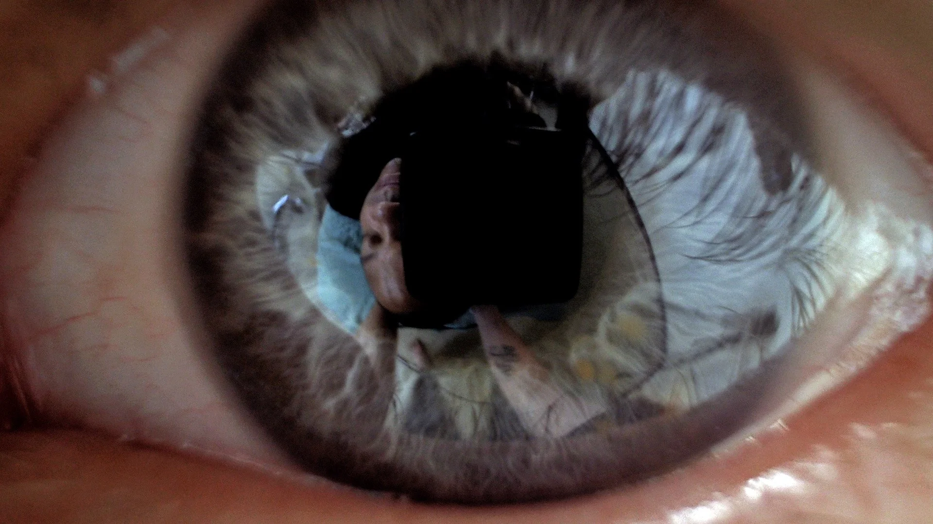 The choreographies of body-therapy and body-search are conflated and contrasted throughout this video, with each performer’s actions further mediated via a camera they wear, pointed at their own eyeball and thus providing a reflected image of the second performer, now the subject of their actions.