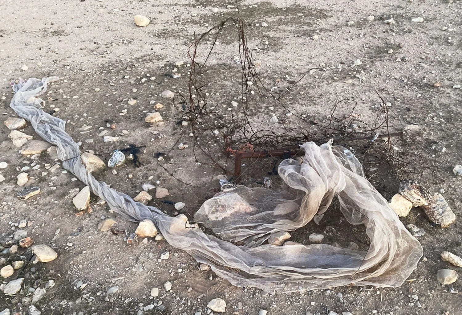 ABOVE LEFT: Iron Horizon was taken at the top of Hazeva Hill facing west, towards Mount Zin. The camera captures a fragment of the improvised monument erected in memory of Ari Perlmutter, a soldier killed in a bus bombing and the son of Simcha Perlmutter, the messianic Jew for Jesus who founded the nearby homestead of Ir Ovot. The video was created by animating a photograph using AI so that the supposedly static landscape we observe is periodically disrupted by various possibilities of motion, from a subtle tremor in the iron stalk to the desert itself transforming into seawater for a few moments.