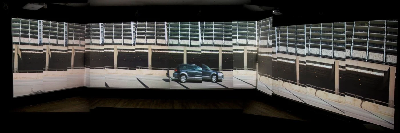 ABOVE: Stripping is a live version of the piece, in which a real-time feed from a performer roaming the venue area is converted into panoramic video strips in real time, alongside manipulated 4 track field-recording tape loops. The performance is site-specific, and has taken place at Hyde Park Art Center in Chicago, and at CentralTrak gallery in Dallas, Texas.
