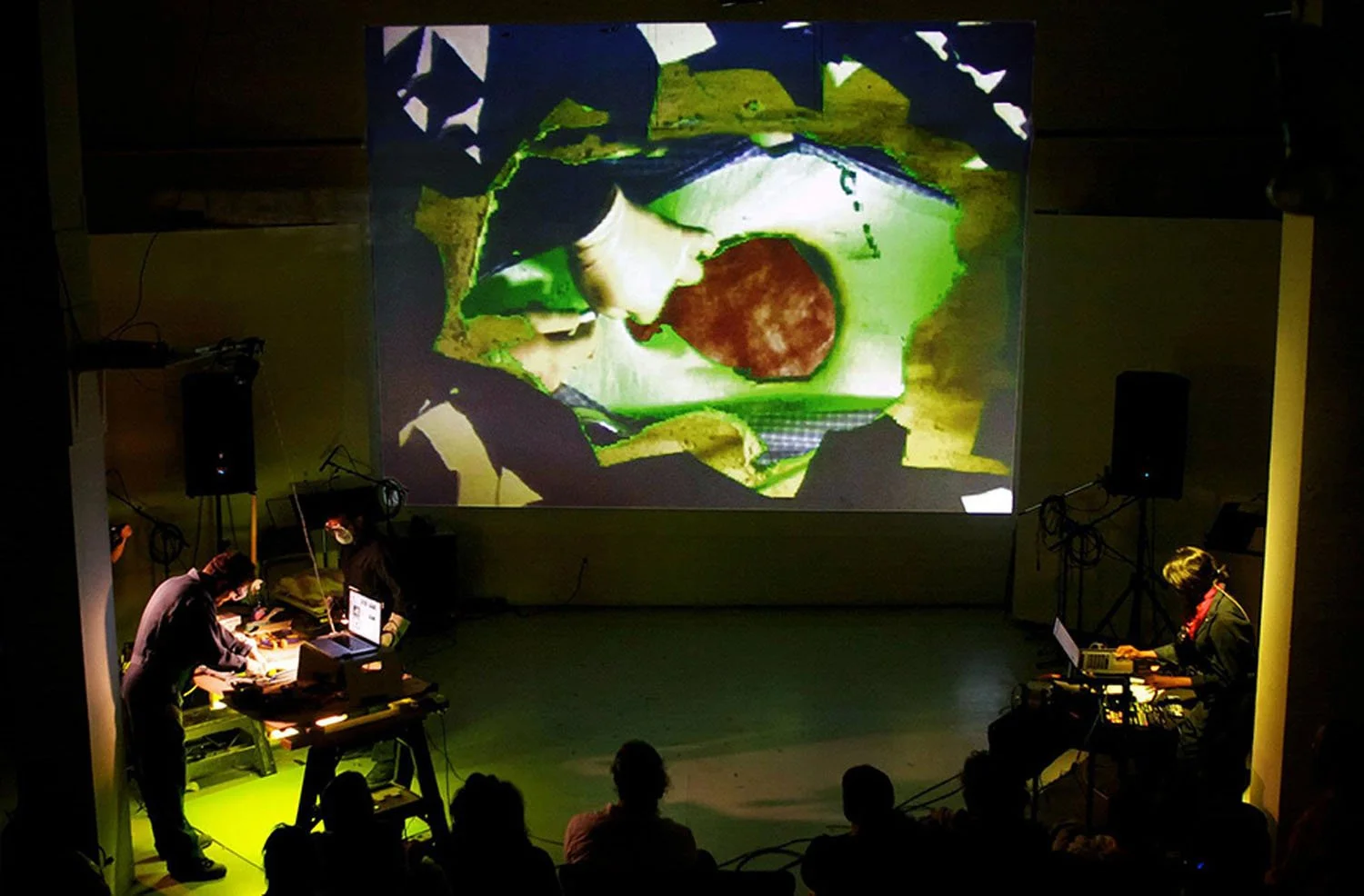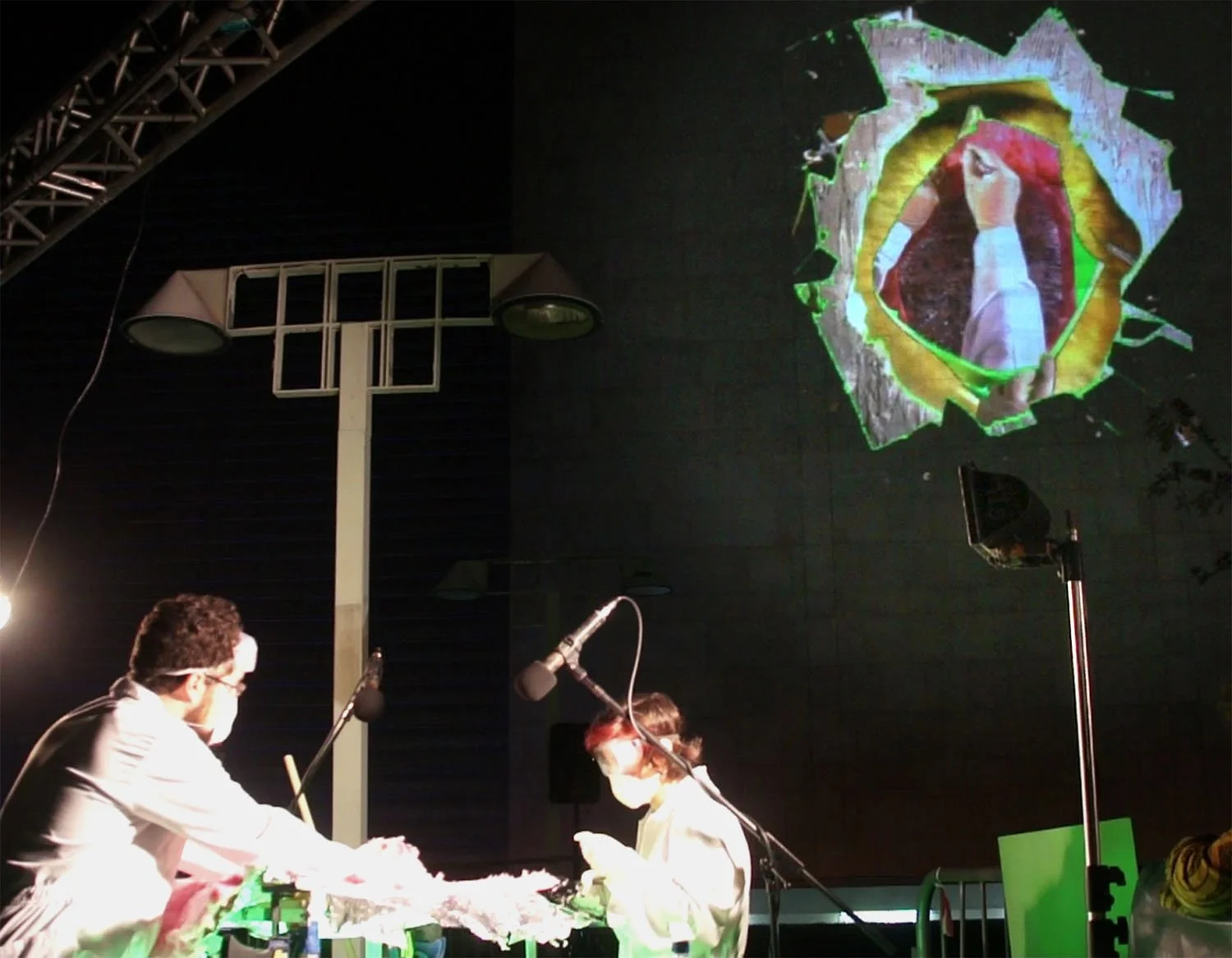This performance serves as a hybrid forensic investigation / tutorial, in which I dig a multilayered, projected tunnel in the wall of the performance space, revealing real and imagined substructures, materials and memories. The process utilizes high and low special effects techniques drawn from across the military-industrial-entertainment complex: from tactical wall probes to domestic demolitions, from live esthetic surgery to interactive cooking shows.